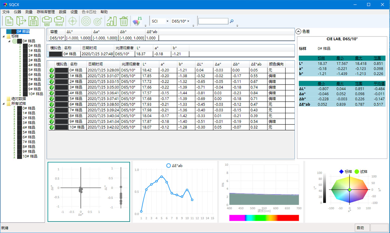 TS7020分光色差儀搭配的SQCX品質管理軟件,適用于各個行業的品質監控和顏色數據管理。將用戶的顏色管理數據化,比較顏色差別,生成測試報告,提供多種色空間測量數據,定制化客戶的顏色管理工作。